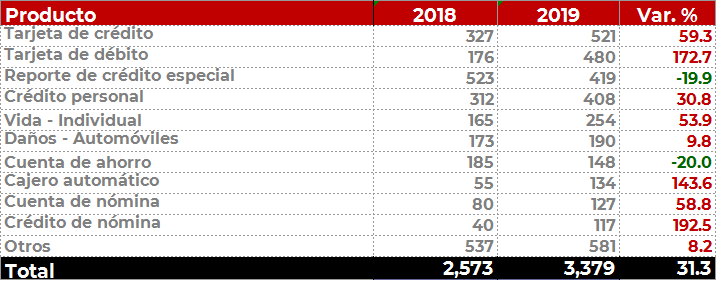 Los productos más reclamados fueron la tarjeta de crédito, la de débito y el Reporte de crédito especial, que en conjunto representaron el 42% del total de las reclamaciones.