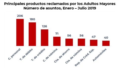 Los principales productos reclamados por los adultos mayores fueron Crédito personal, las Tarjetas de débito y de crédito, los cuales representaron el 49% del total de sus reclamaciones.