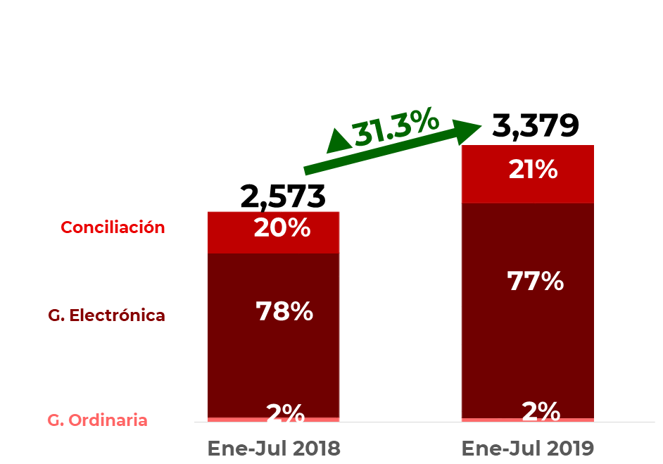 Durante los primeros siete meses de 2019, la CONDUSEF llevó a cabo 3 mil 379 controversias en defensa de los usuarios de productos y servicios financieros, lo que significó un crecimiento de 31.3% respecto al mismo periodo de 2018. De estas controversias, el 77.4% se atendieron vía Gestión Electrónica.