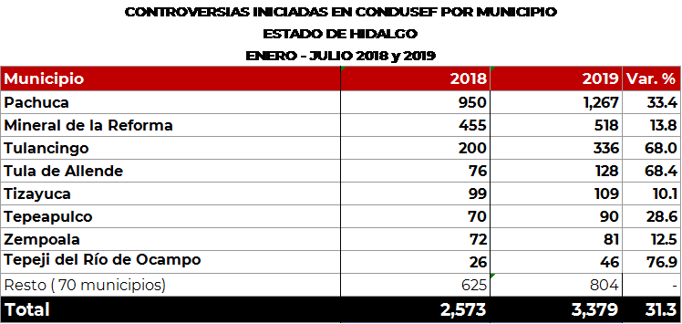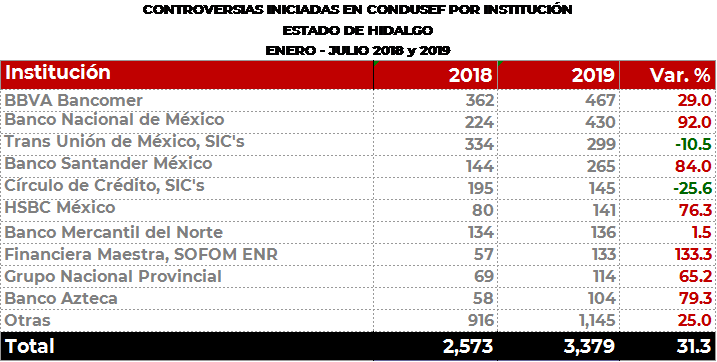 La Comisión Nacional para la Protección y Defensa de los Usuarios de Servicios Financieros (CONDUSEF) informa sobre las controversias iniciadas en el estado de Hidalgo en el periodo enero-julio de 2019 en comparación con el mismo periodo de 2018.