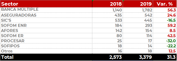 Respecto al incremento de los asuntos, la Banca Múltiple registró un crecimiento importante de 56% respecto a 2018, al igual que las SOFOM E.N.R. y las Aseguradoras, con 59% y 25%, respectivamente.