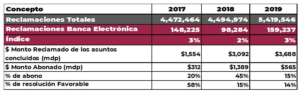 Las reclamaciones de la Banca Electrónica aumentaron 62% respecto a 2018, al pasar de 98 mil a 159 mil y representaron el 3% del total de las reclamaciones. El monto reclamado de los asuntos concluidos ascendió a 3,688 millones de pesos, de los cuales sólo se abonó el 15%.