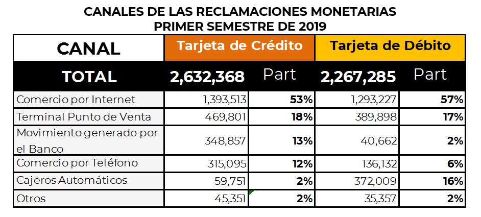 Respecto a los principales canales por los cuales se originaron las reclamaciones en las Tarjetas de Crédito y Débito, fueron comercio por internet y terminal punto de venta, que en conjunto representaron más del 70% de las reclamaciones para cada una de ellas.