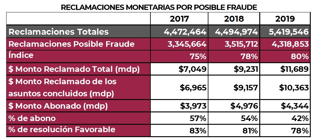 En el periodo analizado, 80 de cada 100 reclamaciones fueron por posibles fraudes, lo que significó un incremento de 2 puntos porcentuales respecto a los registrados en 2018. Las reclamaciones por posibles fraudes pasaron de 3.5 millones en 2018 a 4.3 millones en 2019. Las personas usuarias reclamaron 11,689 millones de pesos, lo que significó un monto promedio reclamado por asunto de 2,706 pesos.