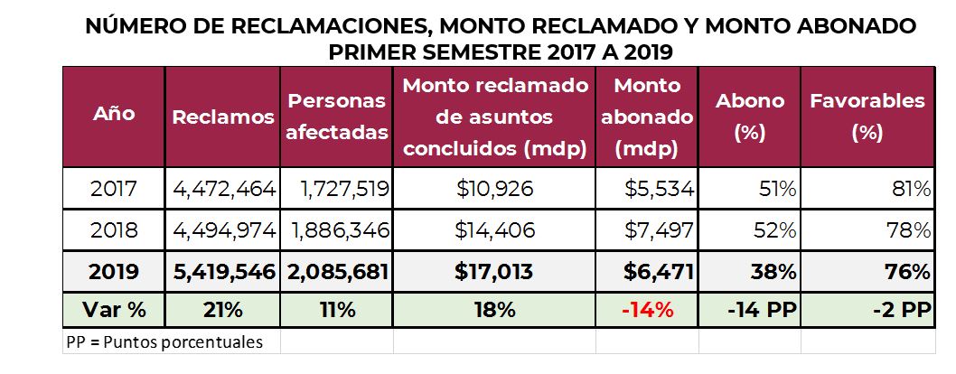 El monto reclamado por las personas usuarias (de los asuntos concluidos) sumó 17,013 millones de pesos, lo que significó 2,607 millones más que lo reportado en el mismo periodo de 2018.