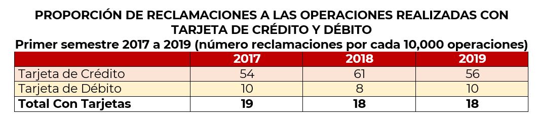 Con el propósito de dimensionar el número de reclamaciones que se presentan con las Tarjetas de Crédito y de Débito, respecto del número de operaciones que también se realizan con ellas, se puede inferir que mientras el número de reclamaciones de Tarjeta de Crédito equivalen a 56 por cada 10,000 operaciones que se realizan con ella; en el caso de la Tarjeta de Débito su índice es de 10 por cada 10, 000 operaciones, manteniéndose el promedio en 18 si se suman las operaciones de ambas.