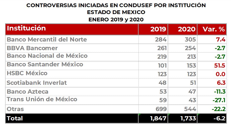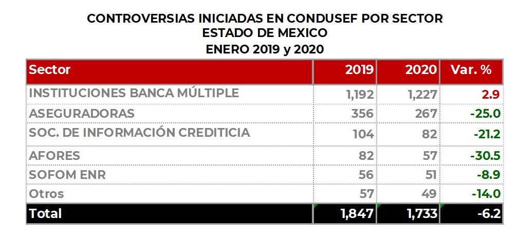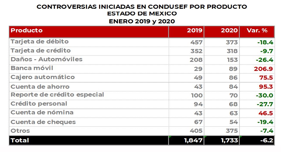 La Comisión Nacional para la Protección y Defensa de los Usuarios de Servicios Financieros (CONDUSEF) informa sobre las controversias iniciadas en el Estado de México durante enero de 2020 en comparación con el mismo periodo de 2019.
