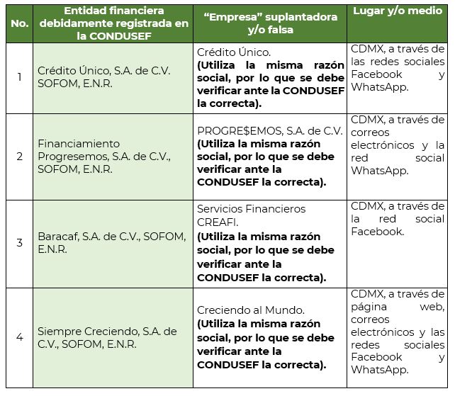 En las últimas semanas, 4 Sociedades Financieras de Objeto Múltiple, Entidades No Reguladas (SOFOMES, E.N.R.) que están debidamente inscritas en el Sistema de Registro de Prestadores de Servicios Financieros (SIPRES) denunciaron ante esta Comisión Nacional el uso fraudulento y suplantación de su nombre comercial e incluso algunos de sus datos fiscales o administrativos, con los cuales defraudan a personas que buscan obtener un crédito “rápido” y “barato”.