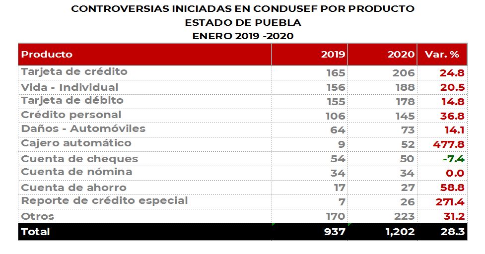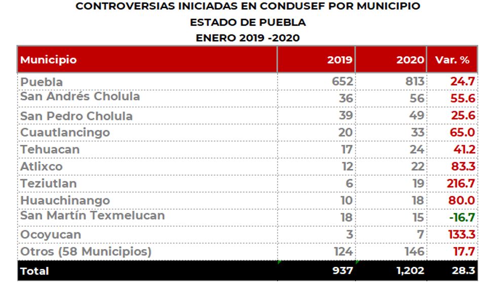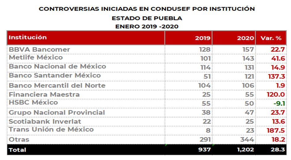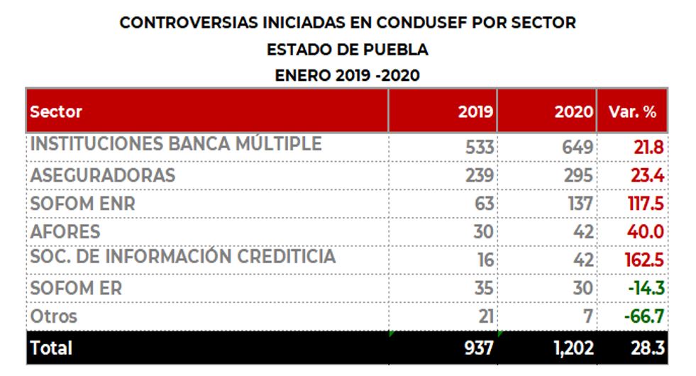 La Comisión Nacional para la Protección y Defensa de los Usuarios de Servicios Financieros (CONDUSEF) informa sobre las controversias iniciadas en el Estado de Puebla en enero de 2020, en comparación con el mismo mes de 2019.