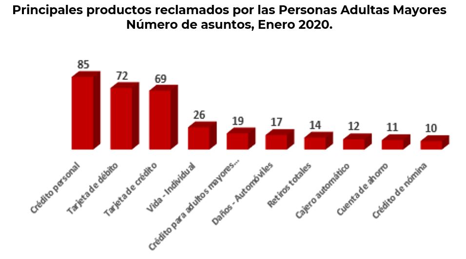 En cuanto a las personas adultas mayores, las reclamaciones de Crédito personal se incrementaron en 51.8%, al pasar de 56 asuntos a 85 asuntos; asimismo, Cajero automático tuvo un importante incremento de 1100%al pasar de 1 a 12 asuntos.