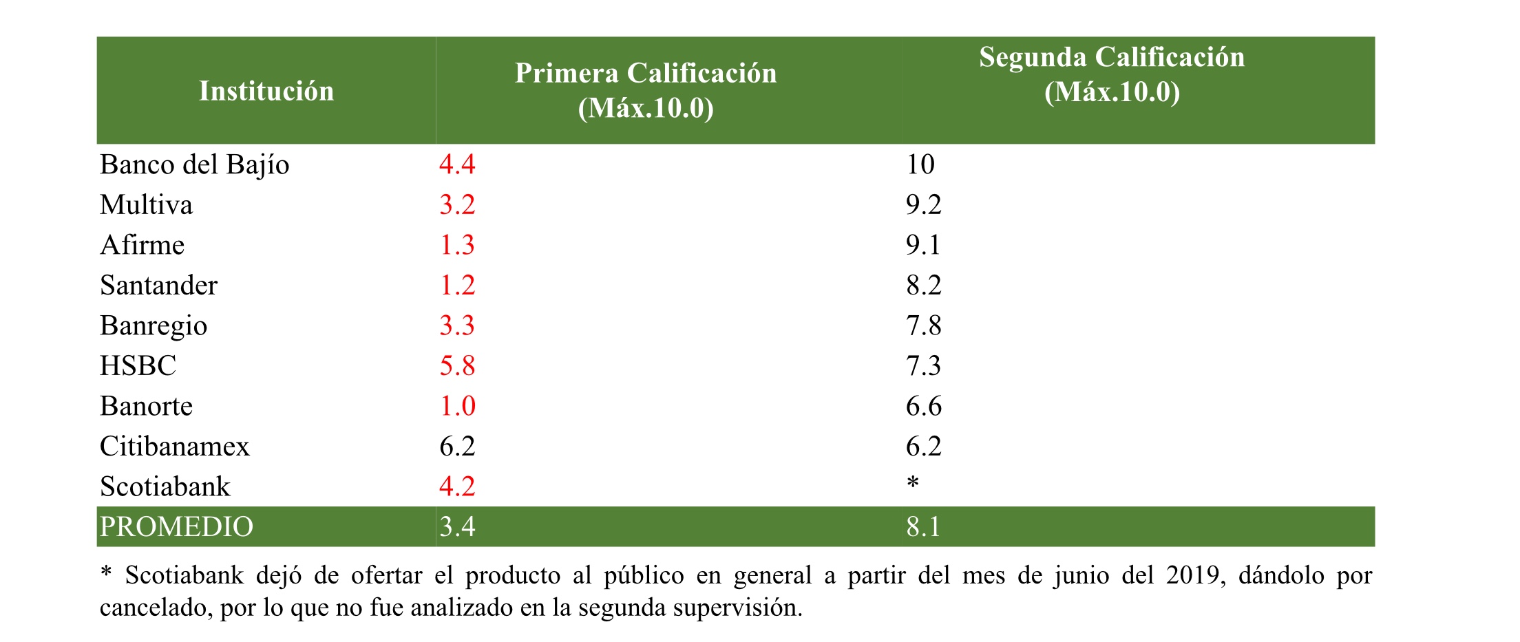 Como se muestra en el cuadro anterior, en la segunda revisión la totalidad de los Bancos alcanzaron una calificación aprobatoria, derivado de que realizaron los cambios ordenados, por lo que el promedio de la calificación pasó de 3.4 a 8.1, lo que representa una mejora en el cumplimiento de la normativa en materia de transparencia y protección a los usuarios.