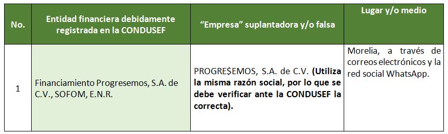 En las últimas semanas, 1 Sociedad Financiera de Objeto Múltiple, Entidad No Regulada (SOFOM, E.N.R.) que está debidamente inscrita en el Sistema de Registro de Prestadores de Servicios Financieros (SIPRES) denunció ante esta Comisión Nacional el uso fraudulento y suplantación de su nombre comercial e incluso algunos de sus datos fiscales o administrativos, con los cuales defraudan a personas que buscan obtener un crédito “rápido” y “barato”.
