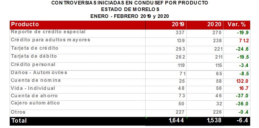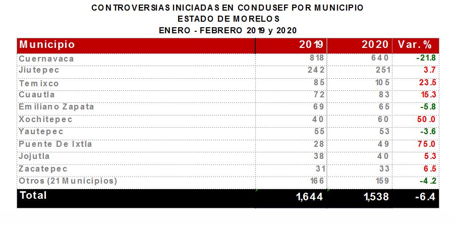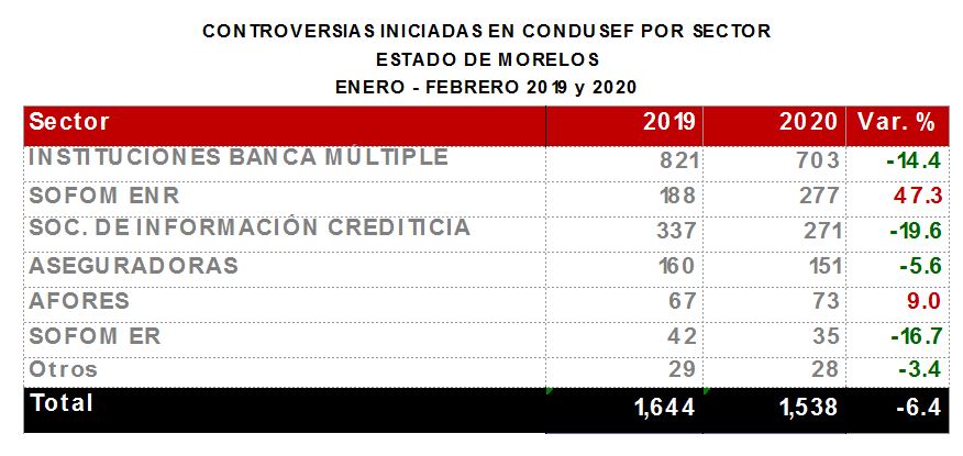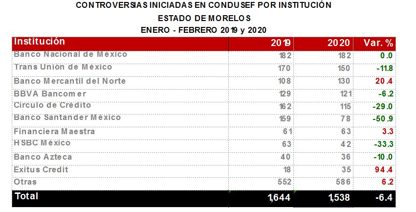 La Comisión Nacional para la Protección y Defensa de los Usuarios de Servicios Financieros (CONDUSEF) informa sobre las controversias iniciadas en el estado de Morelosen el periodoenero-febrero 2020 en comparación con el mismo periodo de 2019.