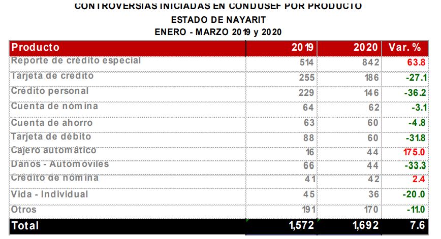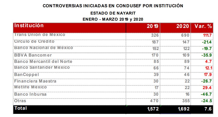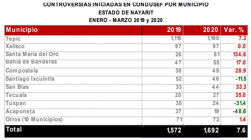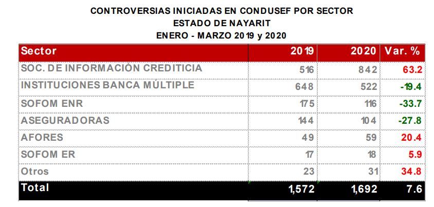 La Comisión Nacional para la Protección y Defensa de los Usuarios de Servicios Financieros (CONDUSEF) informa sobre las controversias iniciadas en el Estado de Nayarit en el periodo enero-marzo de 2020 en comparación con el mismo periodo de 2019.
