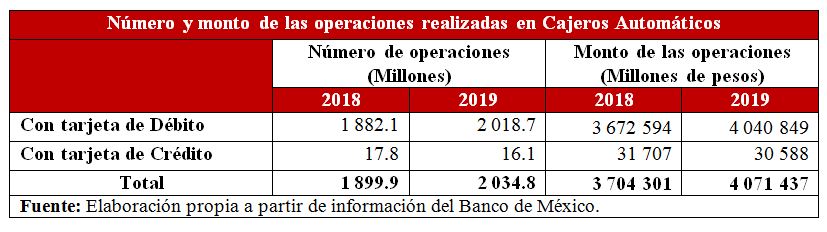 A diciembre pasado, las tarjetas de débito emitidas eran de 127.3 millones y las de crédito sumaban 24.4 millones. Con las primeras se realizaron en 2019 un total de 2 mil 019 millones de operaciones en Cajeros Automáticos y 16.1 millones con las de crédito; así, el uso de la tarjeta de débito significa el 99.2% del total de las transacciones que se realizan a través de Cajeros, con el 99.3% del monto operado.