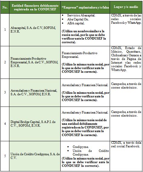 En las últimas semanas, Abacapital, S.A. de C.V, SOFOM, E.N.R.; Financiamiento Productivo Empresarial, S.A. de C.V., SOFOM, E.N.R.;Arrendadora y Financiera Nacional, S.A. de C.V., SOFOM, E.N.R.; Digital Bridge Capital, S.A.P.I. de C.V., SOFOM, E.N.R. y la Unión de Crédito Credipyme, S.A. de C.V., que están debidamente inscritas en el Sistema de Registro de Prestadores de Servicios Financieros (SIPRES) informaron a esta Comisión Nacional el uso fraudulento y suplantación de su nombre comercial e incluso algunos de sus datos fiscales o administrativos, con los cuales defraudan a personas que buscan obtener un crédito “rápido” y “barato”.