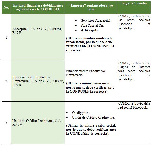 En las últimas semanas, Abacapital, S.A. de C.V, SOFOM, E.N.R., Financiamiento Productivo Empresarial, S.A. de C.V., SOFOM, E.N.R. y la Unión de Crédito Credipyme, S.A. de C.V, que están debidamente inscritas en el Registro de Prestadores de Servicios Financieros (SIPRES) denunciaron ante esta Comisión Nacional el uso fraudulento y suplantación de su nombre comercial e incluso algunos de sus datos fiscales o administrativos, con los cuales defraudan a personas que buscan obtener un crédito “rápido” y “barato”.