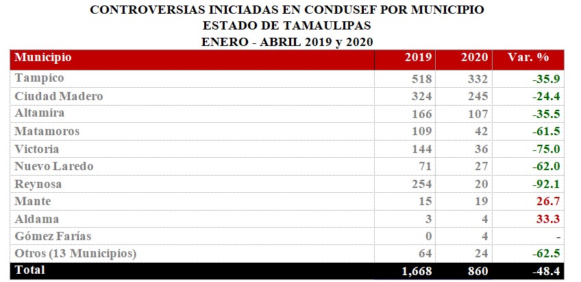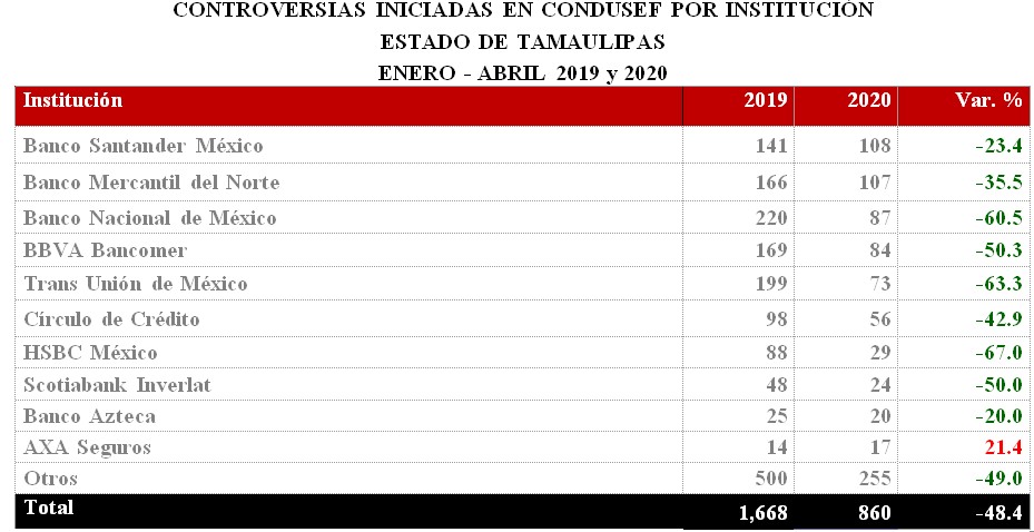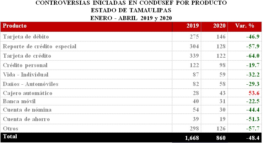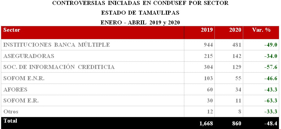 La Comisión Nacional para la Protección y Defensa de los Usuarios de Servicios Financieros (CONDUSEF) informa sobre las controversias iniciadas en el Estado de Tamaulipas en el periodo enero-abrilde 2020 en comparación con el mismo periodo de 2019.