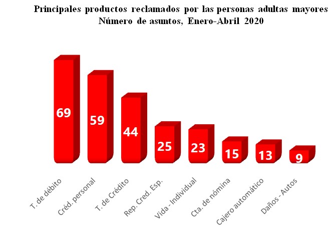 En cuanto a las personas adultas mayores, las controversias de Crédito personal y Cajero automático mostraron un crecimiento de 31% y 225%, respectivamente; al pasar de 45 asuntos a 59 el primero y el segundo de 4 a 13 asuntos.