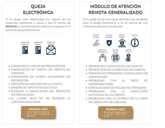 A través de él,las y los usuarios podrán presentar una queja de manera remota desde su casa o lugar de trabajo, los 7 días de la semana y a cualquier hora, en contra de las Instituciones Bancarias, AFORE, Aseguradoras, Sociedades de Información Crediticia, SOFOM Reguladas y No Reguladas, Sociedades Cooperativas de Ahorro y Préstamo (SOCAP), así como Sociedades Financieras Populares (SOFIPO), situación que ahora cobra mayor utilidad en atención a las medidas preventivas que todos debemos adoptar ante la prevalencia de la contingencia provocada por el COVID-19.