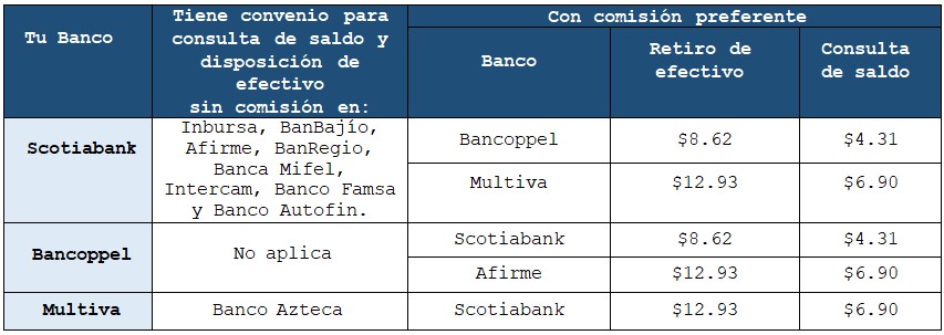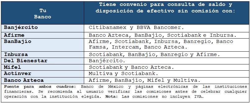 También desconocen que hay bancos que han celebrado un convenio para compartir su red de Cajeros Automáticos con otras instituciones, con el beneficio de NO PAGO de comisión por retiro de efectivo y consulta de saldo o sólo cubrir una comisión preferencial, lo cual permite reducir el gasto si no se encuentra cerca de un cajero del banco emisor de su tarjeta y se requiere efectivo, como se muestra a continuación: