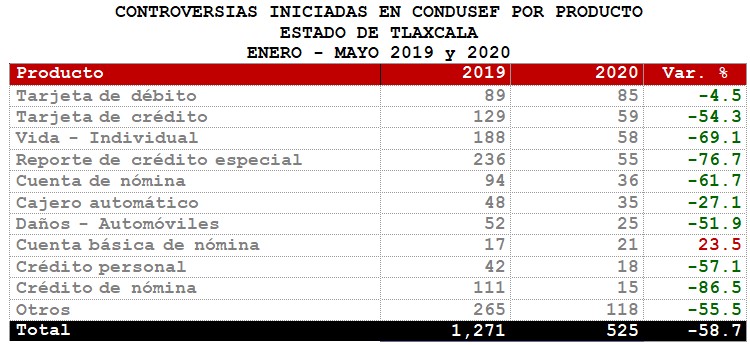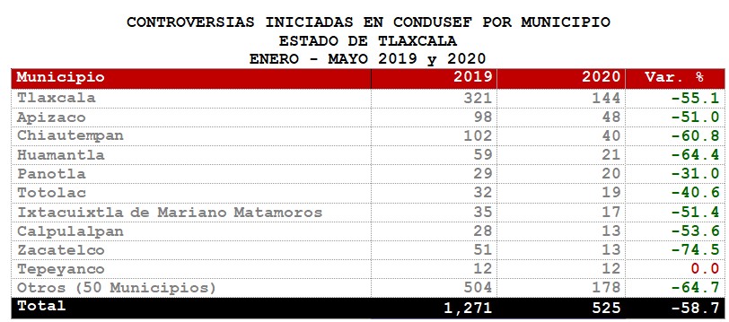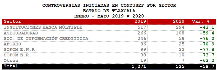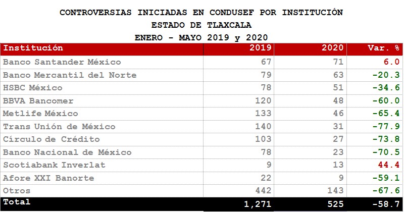 La Comisión Nacional para la Protección y Defensa de los Usuarios de Servicios Financieros (CONDUSEF) informa sobre las controversias iniciadas en el Estado de Tlaxcalaen el periodoenero-mayo 2020 en comparación con el mismo periodo de 2019.