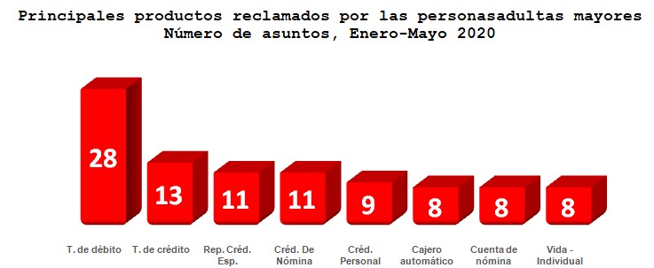 En cuanto a las personas adultas mayores, las controversias de Crédito de Nómina disminuyeron 82.3%, al pasar de 62 a 11 asuntos, mientras que en Cajero automático y Tarjeta de débito aumentaron de 2 a 8 y de 12 a 28 asuntos, respectivamente.