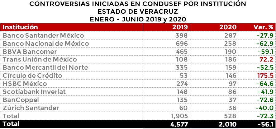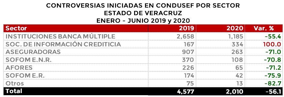 La Comisión Nacional para la Protección y Defensa de los Usuarios de Servicios Financieros (CONDUSEF) informa sobre las controversias iniciadas en el estado de Veracruz en el periodo enero-junio 2020 en comparación con el mismo periodo de 2019.