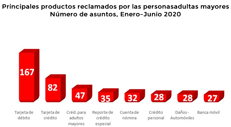 En cuanto a las personas adultas mayores, las controversias de Crédito personal y Cuenta de Nómina disminuyeron en 85% y 80% respectivamente, al pasar de 187 a 28 asuntos el primero y de 162 a 32 el segundo.