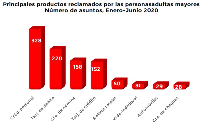 En cuanto a las personas adultas mayores, las controversias de los productos de Crédito personal aumentaron 113%, al pasar de 154 a 328 asuntos, y Cuenta de Nómina pasó de 111 a 158 asuntos, un incremento de 42.3%
