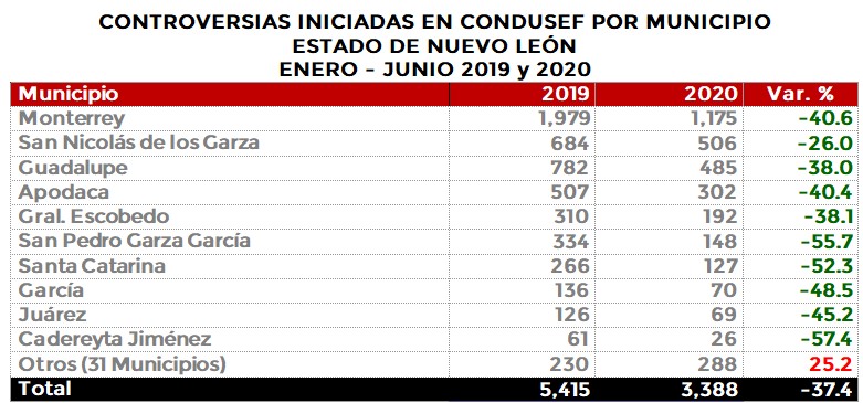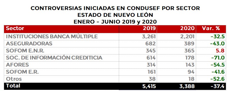 La Comisión Nacional para la Protección y Defensa de los Usuarios de Servicios Financieros (CONDUSEF) informa sobre las controversias iniciadas en el estado de Nuevo Leónen el periodo enero-junio 2020 en comparación con el mismo periodo de 2019.