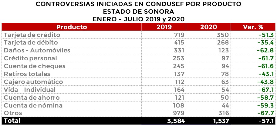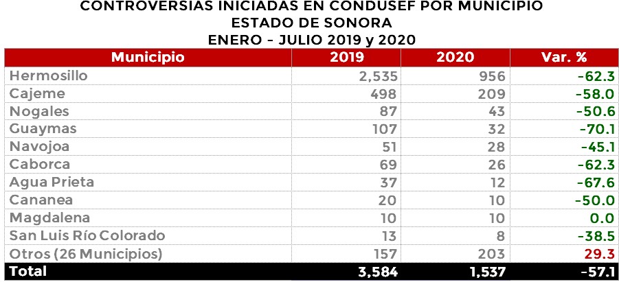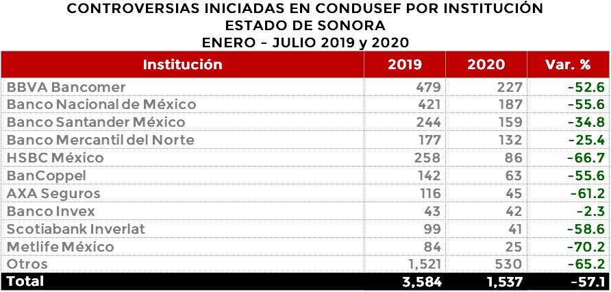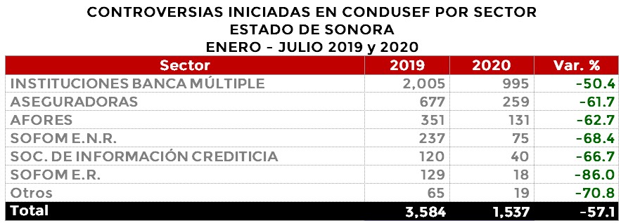 La Comisión Nacional para la Protección y Defensa de los Usuarios de Servicios Financieros (CONDUSEF) informa sobre las controversias iniciadas en el estado de Sonora en el periodo enero-juliode 2020 en comparación con el mismo periodo de 2019.