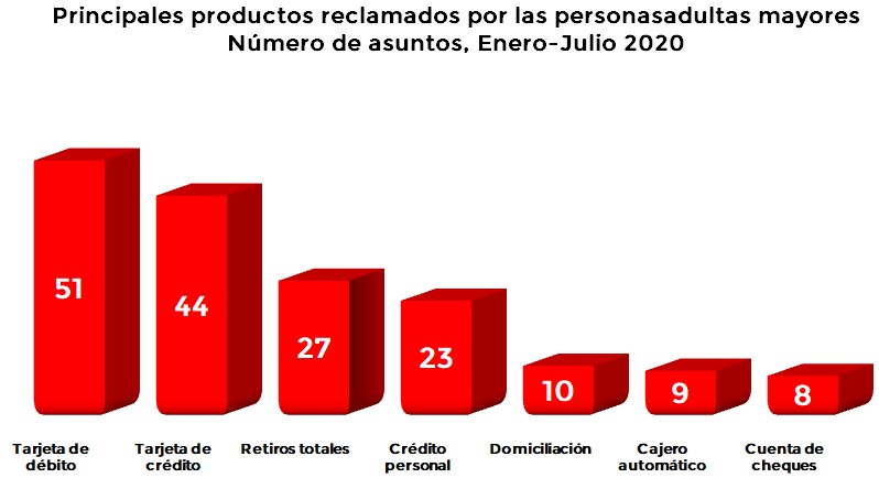 En cuanto a las personas adultas mayores, las controversias de Tarjeta de crédito disminuyeron 52.2% al pasar de 92 a 44 asuntos, mientras que los Retiros totales disminuyeron 52.6%, al pasar de 57 a 27 asuntos.