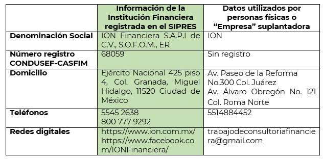ION Financiera S.A.P.I de C.V., S.O.F.O.M., E.R. y Crediavance, S.A. de C.V., SOFOM, E.N.R., son instituciones financieras debidamente inscritas en el Sistema de Registro de Prestadores de Servicios Financieros (SIPRES), por lo que recientemente informaron a la Comisión Nacional para la Protección y Defensa de los Usuarios de Servicios Financieros (CONDUSEF) respecto de la suplantación de su nombre comercial e incluso algunos de sus datos fiscales o administrativos, por lo que tal y como se ha venido haciendo, se informa a la población los nombres de las instituciones financieras afectadas y los datos utilizados en la suplantación: