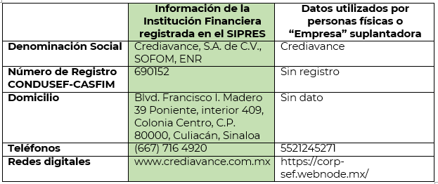 - Las instituciones financieras ION Financiera S.A.P.I de C.V., S.O.F.O.M., E.R. y Crediavance, S.A. de C.V., SOFOM, E.N.R., se encuentran debidamente inscritas en el SIPRES y están siendo suplantadas por personas físicas o "empresas" ficticias que utilizan su razón social y datos corporativos para afectar económicamente a usuarios que requieren de un crédito.