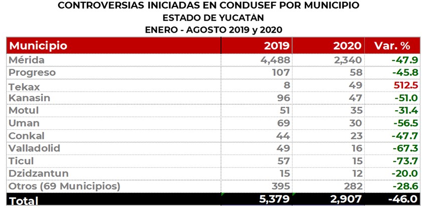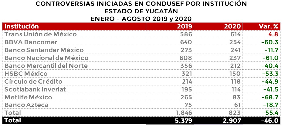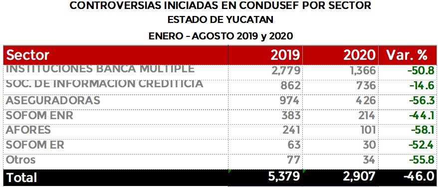 La Comisión Nacional para la Protección y Defensa de los Usuarios de Servicios Financieros (CONDUSEF) informa sobre las controversias iniciadas en el estado de Yucatánen el periodo enero-agosto de 2020 en comparación con el mismo periodo de 2019.
