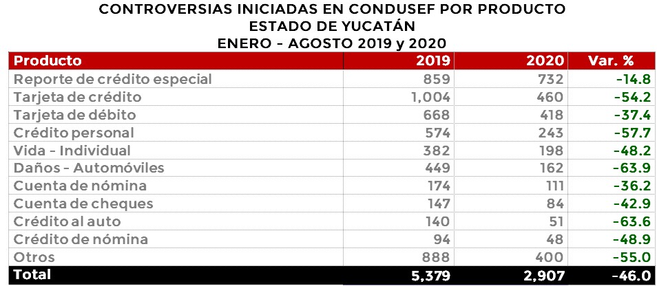 Los productos más reclamados en el estado de Yucatán fueron: Reporte de Crédito Especial, Tarjeta de crédito, Tarjeta de débito y Crédito personal que en conjunto representaron el 63.7% del total de las controversias; sin embargo todos mostraron un decremento respecto del mismo periodo de 2019.