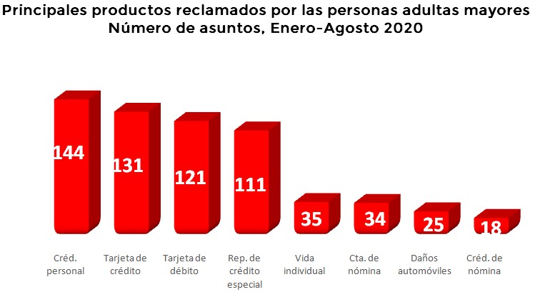 En cuanto a las personas adultas mayores, destaca el decremento de 55.3% de las controversias de la Tarjeta de crédito, al pasar de 293 a 131 asuntos, mientras que la Domiciliación fue el único producto que incrementó sus controversias, al pasar de 4 a 16 asuntos.