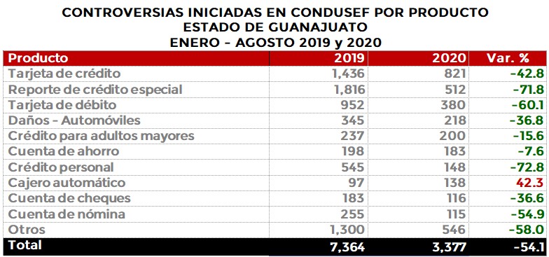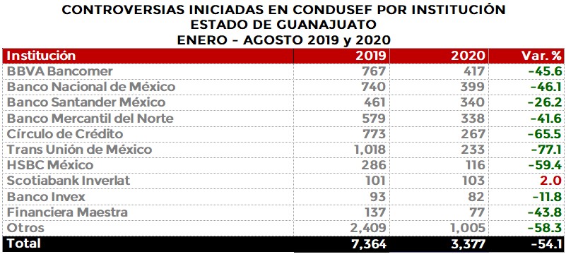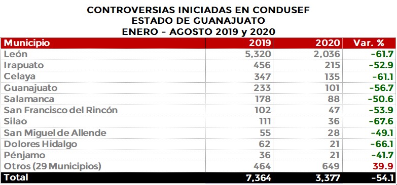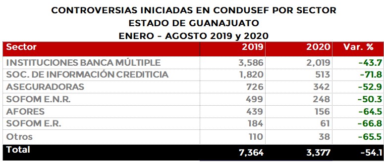 La Comisión Nacional para la Protección y Defensa de los Usuarios de Servicios Financieros (CONDUSEF) informa sobre las controversias iniciadas en el estado de Guanajuato en el periodo enero-agosto de 2020 en comparación con el mismo periodo de 2019.