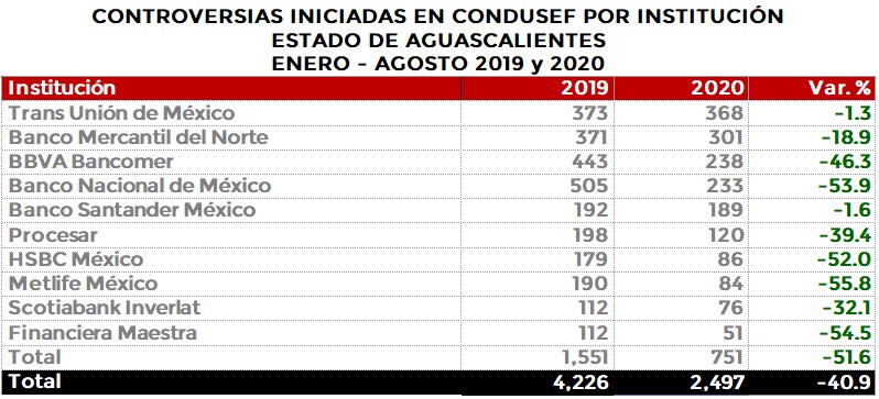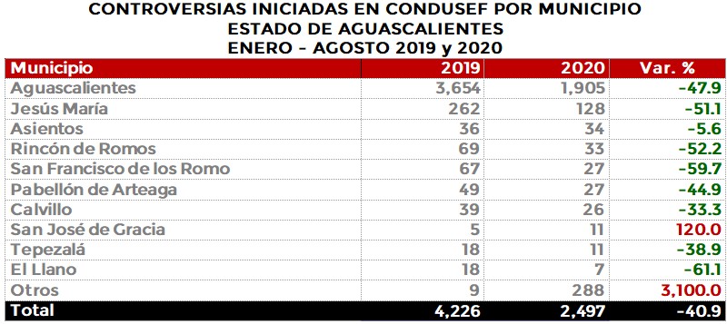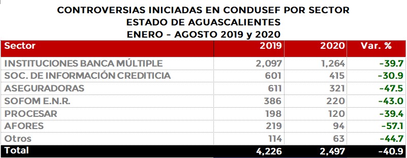 La Comisión Nacional para la Protección y Defensa de los Usuarios de Servicios Financieros (CONDUSEF) informa sobre las controversias iniciadas en el estado de Aguascalientes en el periodo enero-agostode 2020 en comparación con el mismo periodo de 2019.