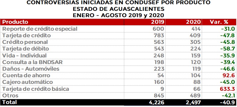 Los productos más reclamados en el estado de Aguascalientes fueron: Reporte de crédito especial, Tarjeta de crédito, Crédito personal y Tarjeta de débito que en conjunto representaron el 54.1% del total de las controversias; destacando la caída de Tarjeta de crédito y tarjeta de débito.