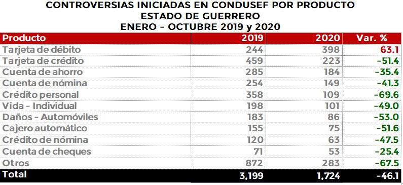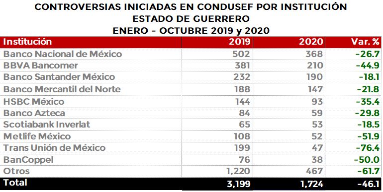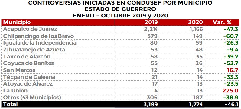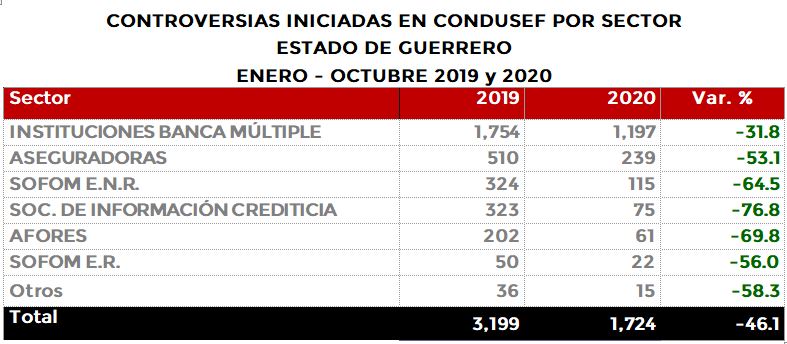 La Comisión Nacional para la Protección y Defensa de los Usuarios de Servicios Financieros (CONDUSEF) informa sobre las controversias iniciadas en el estado de Guerrero en el periodo enero-octubre de 2020 en comparación con el mismo periodo de 2019.