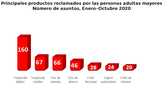 En cuanto a las controversias de las personasadultas mayores, también destaca el aumento de Tarjeta de débito de 77.8%, al pasar de 90 a 160 asuntos, mientras que Crédito Personal disminuyó un 83.5% al pasar de 170 a 28 asuntos.