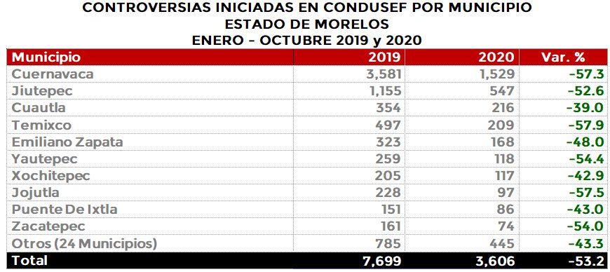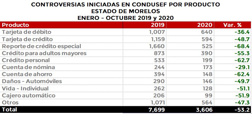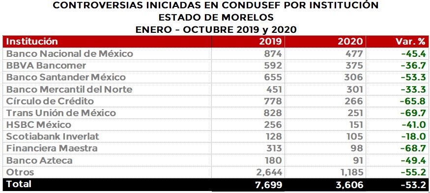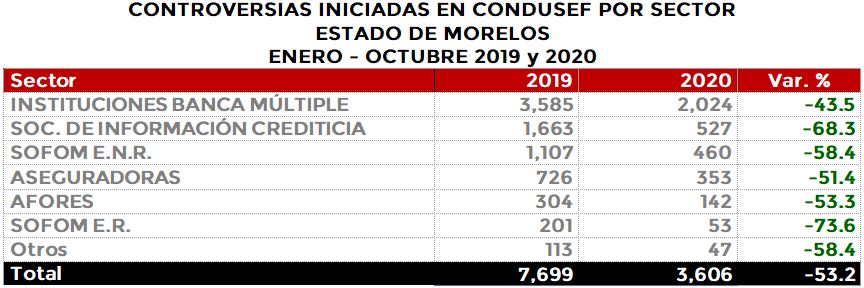 La Comisión Nacional para la Protección y Defensa de los Usuarios de Servicios Financieros (CONDUSEF) informa sobre las controversias iniciadas en el estado deMorelosen el periodoenero-octubre de 2020 en comparación con el mismo periodo de 2019.