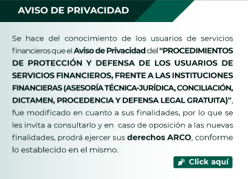En cumplimiento con las obligaciones encomendadas en la Ley General de Protección de Datos Personales en Posesión de Sujetos Obligados y en los Lineamientos Generales de Protección de Datos Personales para el Sector Público, la Comisión Nacional para la Protección y Defensa de los Usuarios de Servicios Financieros (CONDUSEF) pone a disposición de la ciudadanía los Avisos de Privacidad Integrales de las diversas unidades administrativas y operativas de esta Comisión, a fin de que los titulares de los datos personales, conozcan el tratamiento que se dará a los mismos y puedan tomar decisiones informadas al respecto.