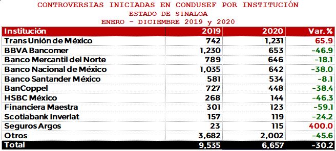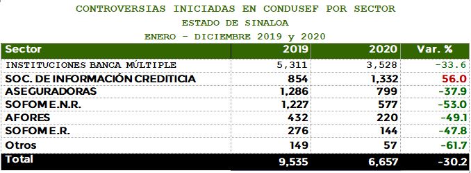 La Comisión Nacional para la Protección y Defensa de los Usuarios de Servicios Financieros (CONDUSEF) informa sobre la evolución de las controversias iniciadas en el estado deSinaloadurante 2020 en comparación con el año anterior.