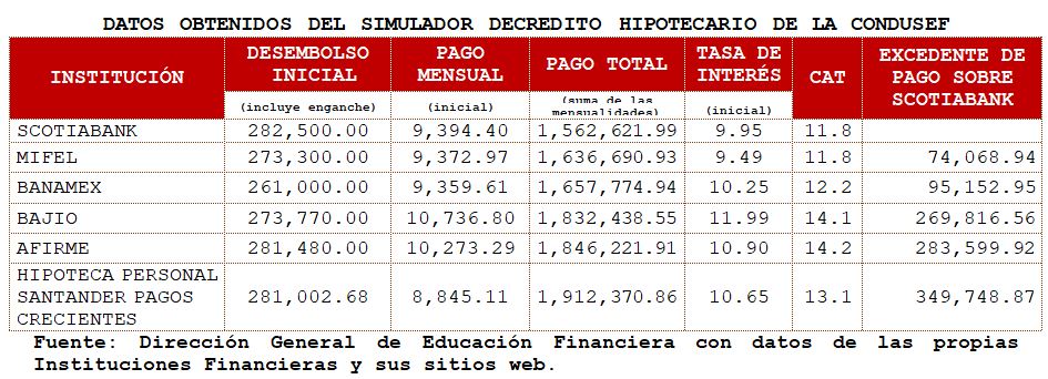En el siguiente cuadro se muestra un resumen de tres casos con pago total más bajo y tres de los más elevados, cada uno con su respectiva tasa de interés y CAT. Adicionalmente se incluye la diferencia entre el pago total de la opción más baja, en este caso Scotiabank y cada una de las demás opciones. Podemos ver que para Hipoteca Personal Santander la diferencia de más es de casi 350 mil pesos al final del plazo, sin embargo es la que ofrece unpago inicial menor (ya que este puede aumentar dependiendo del esquema de pagos de cada institución y los seguros inherentes al crédito).