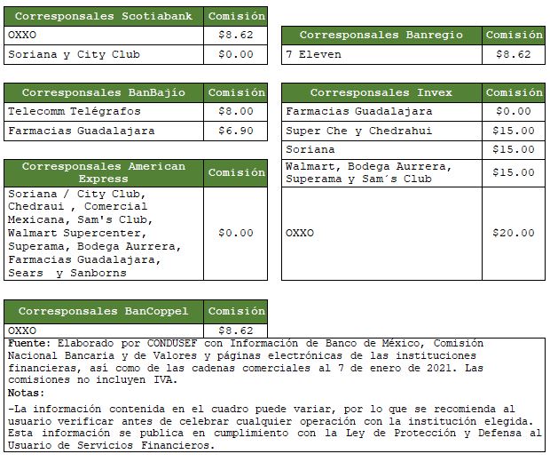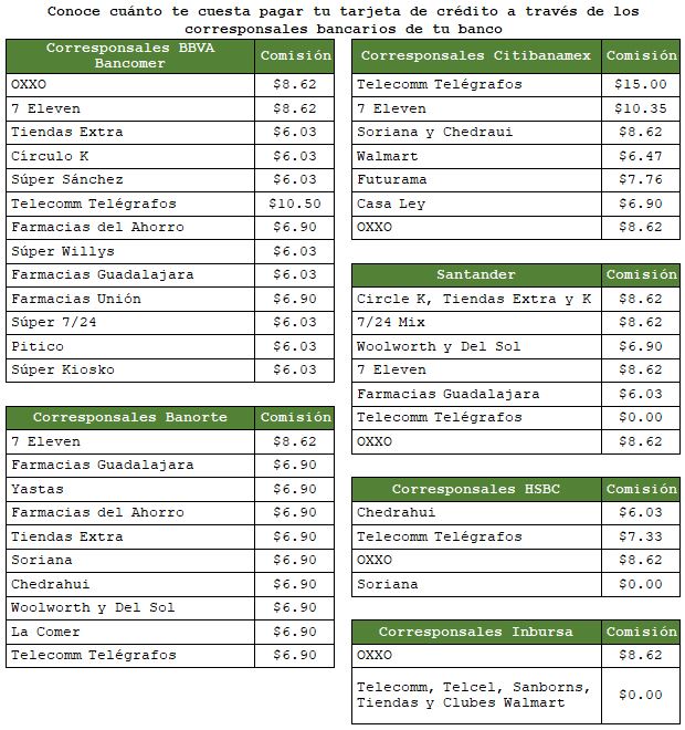Así por ejemplo, mientras que BBVA opera con 13 corresponsales y la comisión que se puede cobrar al pagar la tarjeta de crédito emitida por dicho banco puede ir de $6.03 pesos a $10.50 pesos, dependiendo con quien acudas a realizar la operación, en el caso de Citibanamex, sus corresponsales (7) te pueden cobrar de $6.47 a $15.00 pesos, según el que elijas, de ahí que estar informado puede evitarte pagar de más.