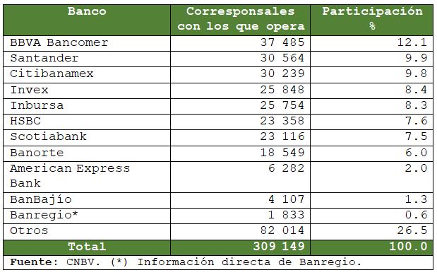 De acuerdo con la información disponible a noviembre pasado, los 12 bancos que se señalan en el cuadro anterior tienen un total de 227 mil 135 puntos de atención de algunos de los principales corresponsales que han sido autorizados por la Comisión Nacional Bancaria y de Valores (CNBV) para prestar servicios financieros en nombre de los bancos con los que tienen suscrito un convenio, lo que representa el 73.5% del total.