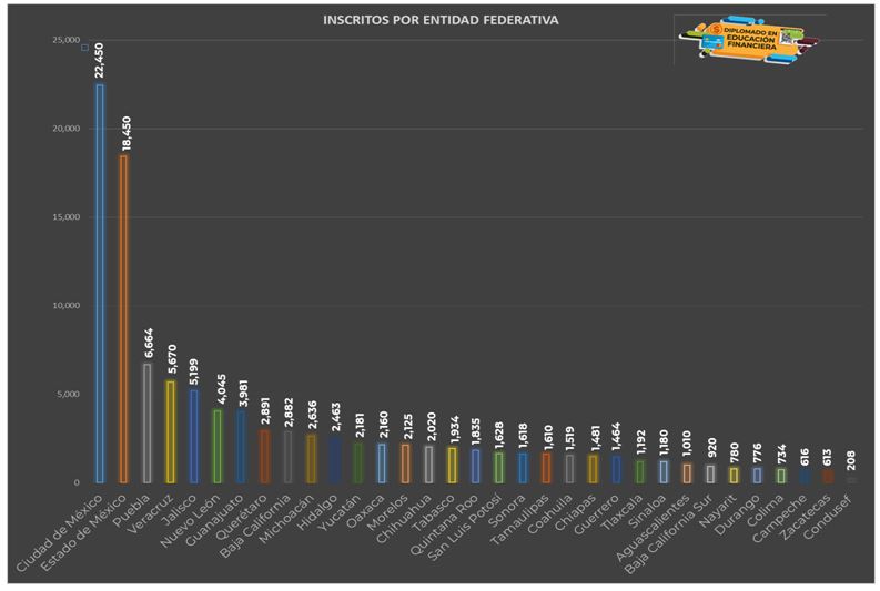 De los aspirantes que se inscribieron al Diplomado: 46 mil 146 son ESTUDIANTES, 31 mil 256 son EMPLEADOS O COLABORADORES y 26 mil 427 PROFESIONISTAS INDEPENDIENTES. Los 10 estados con el mayor número de inscritos son: Ciudad de México, Estado de México, Puebla, Veracruz, Jalisco, Nuevo León, Guanajuato, Querétaro, Baja California y Michoacán. En conjunto estos 10 estados concentran el 67.5% del total.